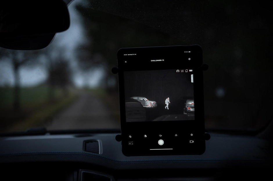 T-Crow XRII 在車窗(左)和車頂(右)上裝有不同的攝像頭。 XSPECTRE 的 T-Crow 三腳架具有集成的 360° 旋轉和 55° 的附加傾斜範圍,使您能夠從車內舒適地跟踪動物和障礙物。 |