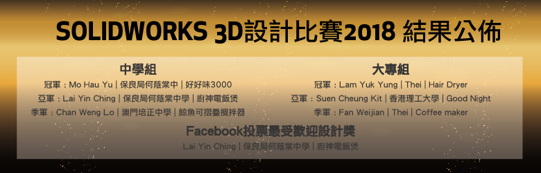 | 為了向教育界推動創新的產品設計行業,智誠科技有限公司每年均舉辦SOLIDWORKS 3D設計比賽,今年已經是第11屆。歷屆的設計比賽之成功,有賴教育界及專業的評判團的踴躍支持,大賽吸引了全港中學大專院校過百學界人士參與,反應熱烈。往後,智誠科技有限公司希望各界可以繼續支持此活動,使比賽得以順利繼續進行。今年本公司再度舉辨比賽,希望各界學生透過活動提出創新的產品設計意念及提昇對3D設計軟件的熟練度,並從生活中發揮創意,展現無限潛能。