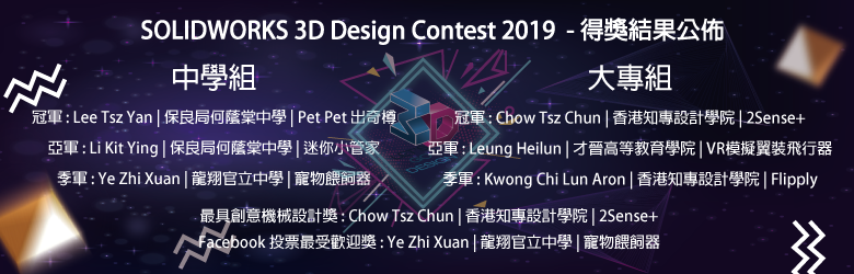 | 為了向教育界推動創新的產品設計行業,智誠科技有限公司每年均舉辦SOLIDWORKS 3D設計比賽,今年已經是第12屆。歷屆的設計比賽之成功,有賴教育界及專業的評判團的踴躍支持,大賽吸引了全港中學大專院校過百學界人士參與,反應熱烈。 今年本公司特設「最具創意機械設計獎」,擴闊參加者的範疇,藉此鼓勵更多對產品設計有熱誠及潛質的學生參與,並從生活中發揮創意,展現無限潛能。